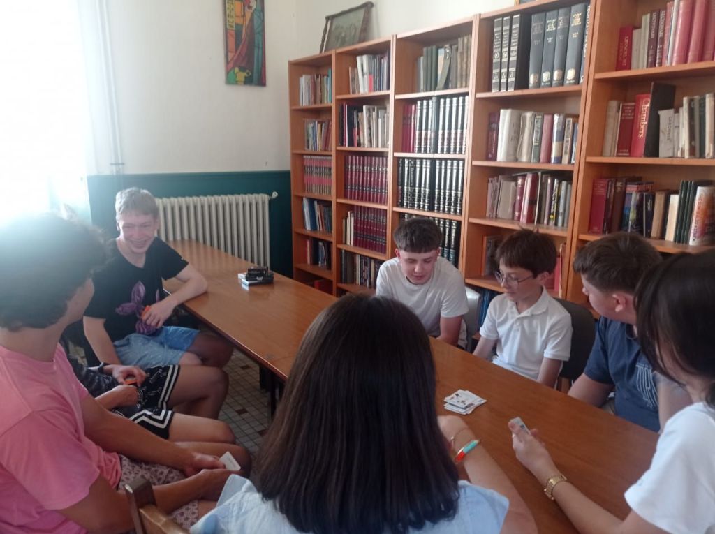Students from France, Spain and Ukraine making friends, playing cards and speaking English together, summer 2025.